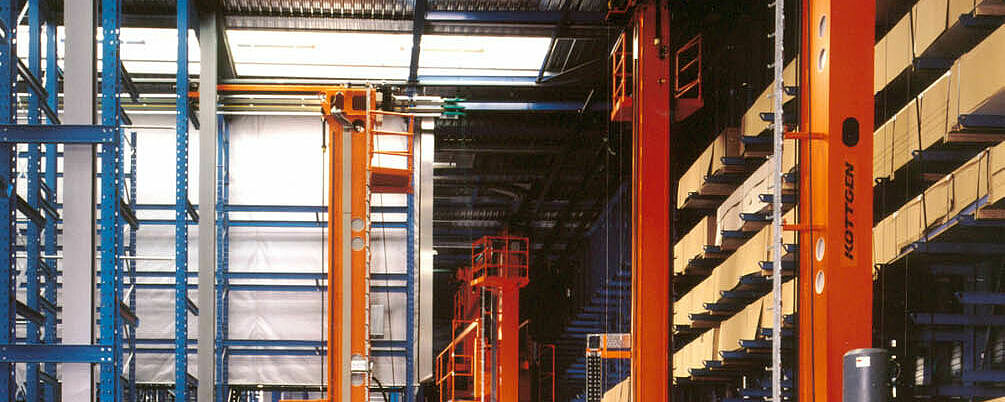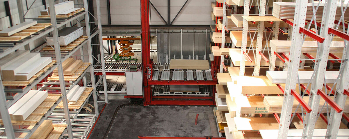 Die Lageroptimierung durch Teil- und Vollautomatisierung von Ein- und Auslagervorgängen ermöglicht eine effiziente automatische Lagerung mittels Regalsystemen. Nach dem Prinzip „Ware zum Mann“ erhöht sich die Leistungsfähigkeit beihohen Kommissionierleistungen. Je nach Anforderung können ganze Pakete oder einzelne Platten entnommen und zur Übergabestation befördert werden.