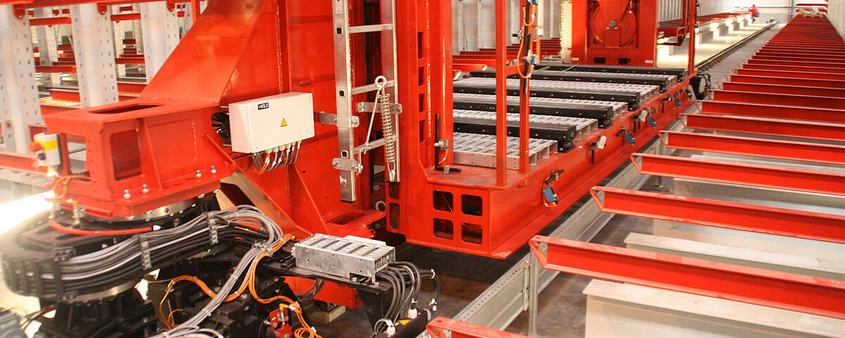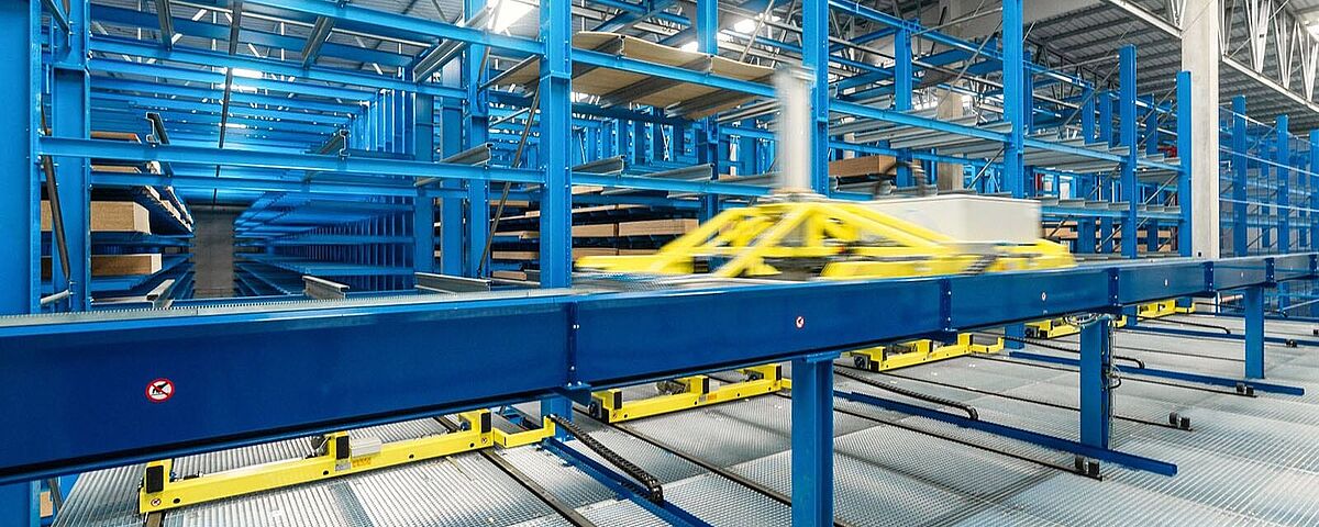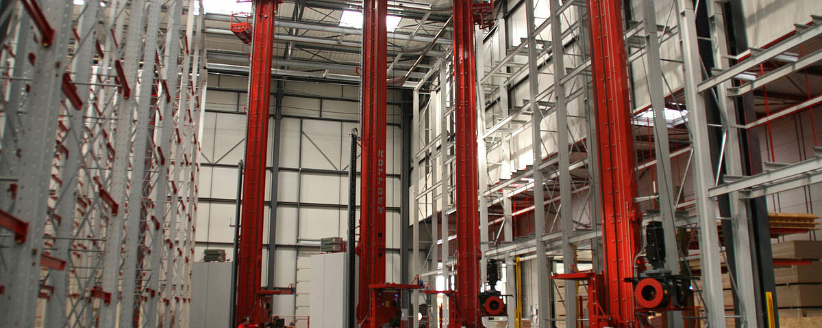 Regalbediengerät in einer Regalgasse, wo Spanplatten gelagert werden. Führungsschienen rechts und links.