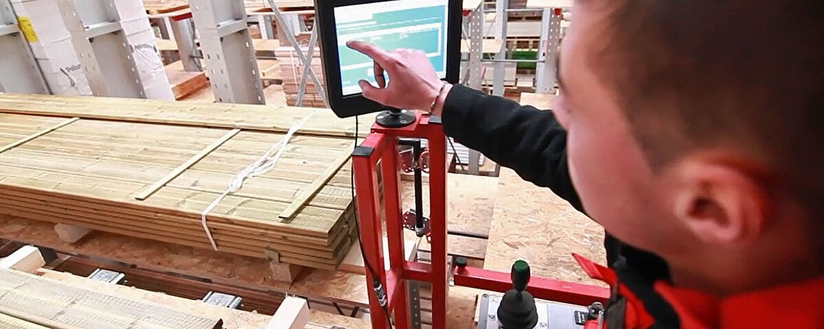 Kommissionierstation bei einem Holzhändler. Das Vakuum-Sauggerät kommissioniert auch einzelne Platten