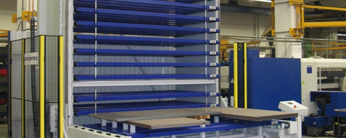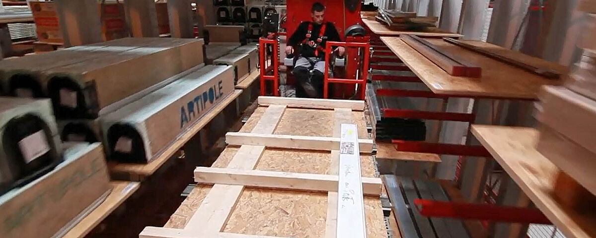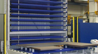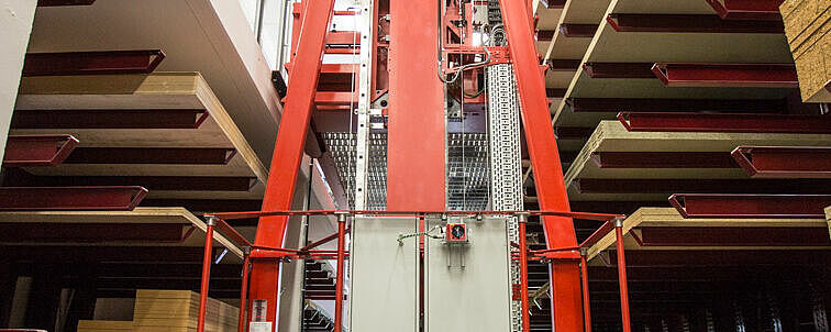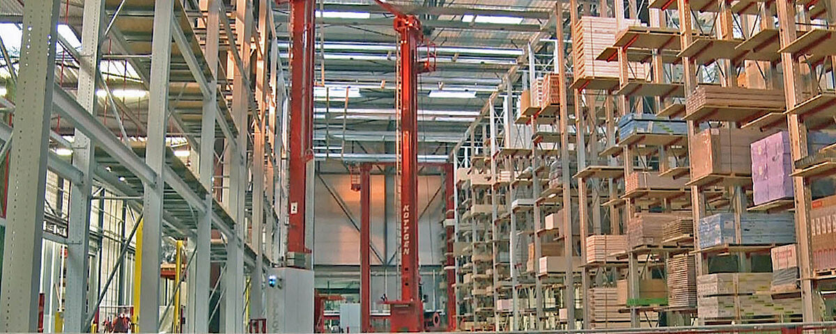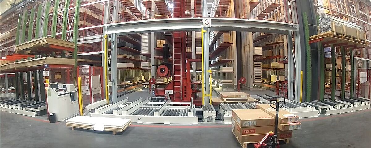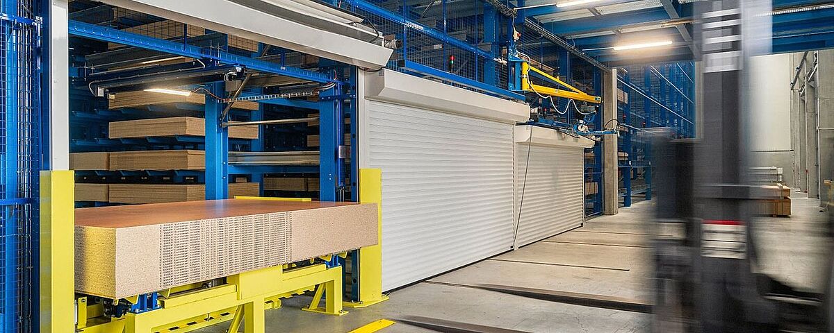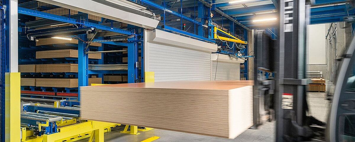 Automatische Lagerung von Spanplatten bei einem Holzhändler in der Schweiz.