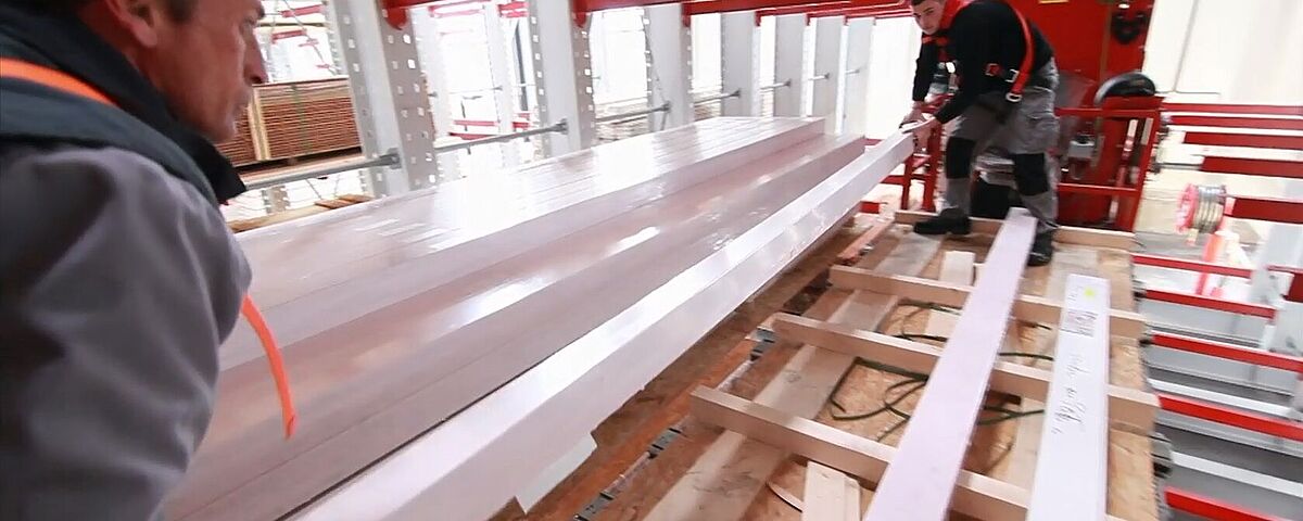 Herzstück des Betriebs-Neubaus der Robert Fehr AG in Andelfingen, Schweiz, ist ein halbautomatisches Lagersystem für bis zu 6 Meter lange und 2.5 Meter breite Holzbau-Platten.