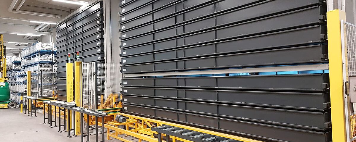 2. Der TowerMat TM-FE ist auf mittlere Lagerkapazitäten ausgelegt und ermöglicht dank mehrerer Lagertürme und zentralem Regalbediengerät eine besonders hohe Effizienz.