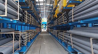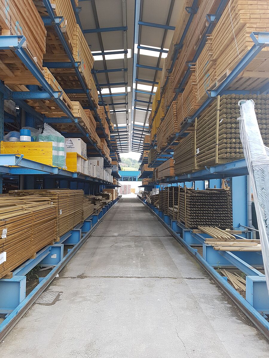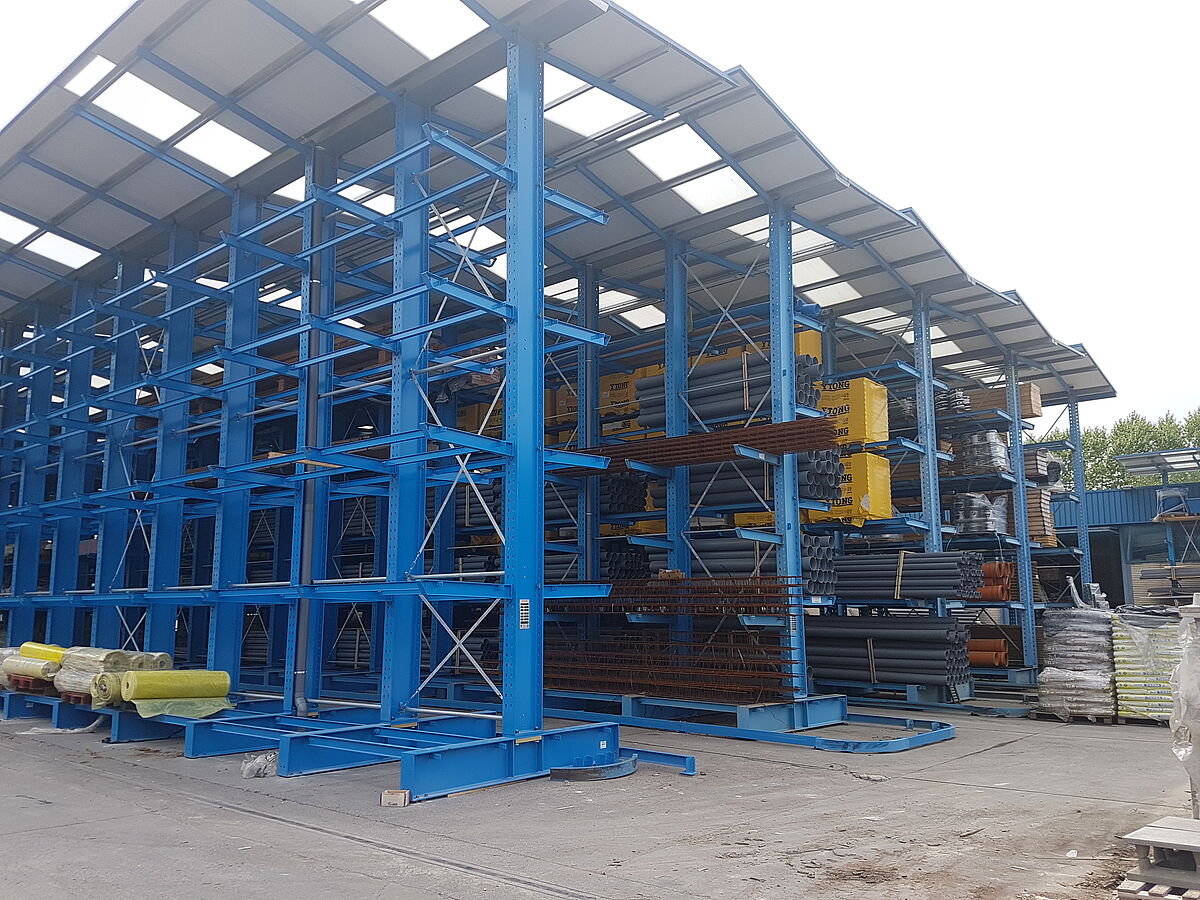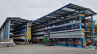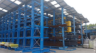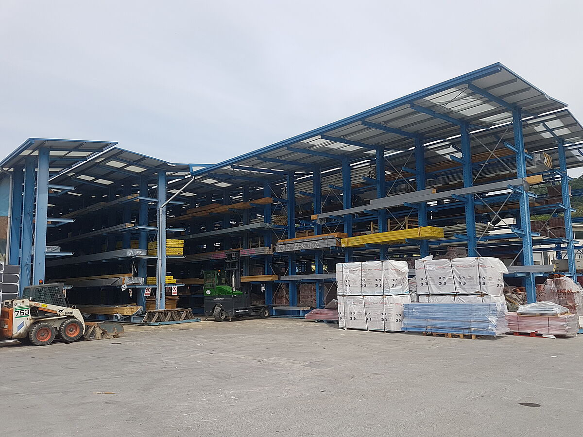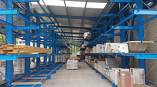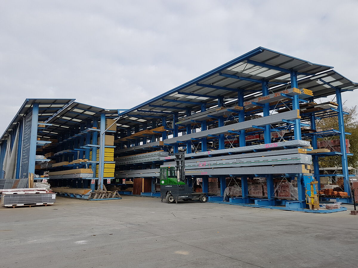 Im Außenbereich dient eine aus Kragarmregalen aufgebaute Regalhalle, die in 2017 erweitert wurde, als Lager für verschiedene Materialien wie Holz, Eisen und schwere Bauelemente. Dabei dienen die robusten Kragarmregale sowohl als Warenträger – mit 1.850 Kilogramm Armlast und auf fünf Lagerebenen – als auch als Unterkonstruktion für die Dachkonstruktion. In einigen Bereichen wurden Armbrücken montiert, um großes palettiertes Material aufzunehmen. Um das Gewicht des Daches zu tragen, wurden spezielle Dachträger installiert, die für diese Funktion ausgelegt sind. An den Ständern angebrachte Führungsschienen ermöglichen das einfache Befahren der bis zu 62 Meter langen fünf Regalzeilen mit dem Seitenstapler.