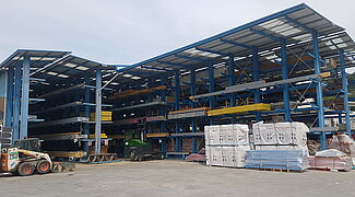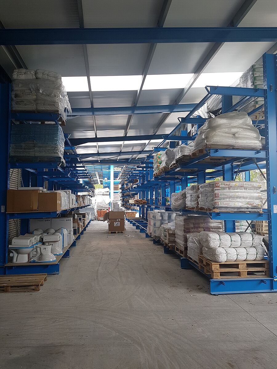 Neu ist eine zwei-zeilige Regalanlage mit ein- und zweiseitig eingehängten Kragarmen mit Armbrücken. Sie ersetzt das bisherige am gleichen Standort untergebrachte Blocklager, in dem unterschiedliche palettierte Baustoffe Platz fanden. Die neuen Regale mit vier Lagerebenen wurden unter dem vorhandenen Dach installiert und ermöglichen heute im Vergleich zur Blocklagerung eine wesentliche einfachere Kontrolle der Bestände sowie einen schnelleren und einfacheren Zugriff auf die Waren.