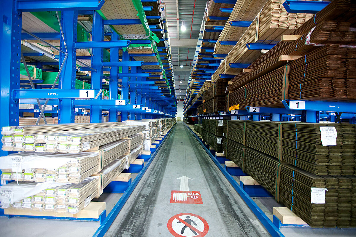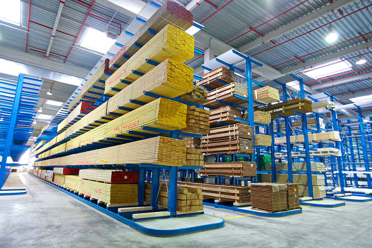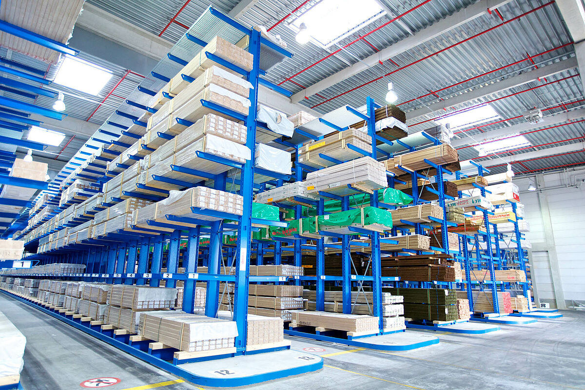 In der Kragarmregalanlage wird Langgut mit einer Länge von bis zu 13 m und einem Paketgewicht von bis zu 4 t gelagert.
