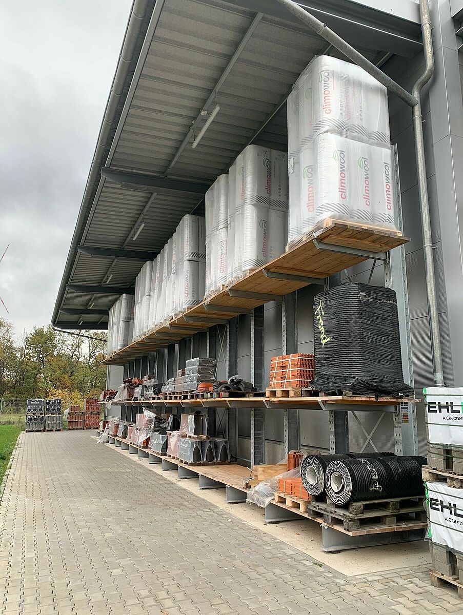 Die neu errichtete, 12 Meter hohe Lagerhalle entstand auf einer Fläche von 1.000 Quadratmetern und bietet zusätzlichen Platz für neue Artikel wie Fassadenpaneele, Dämmplatten oder Konstruktionsvollholz. Viele der jetzt komfortabel und geschützt in Regalen untergebrachten Artikel wurden früher im Außenbereich und auf dem Boden gelagert. So konnte mit den bis zu 6,58 Meter hohen Palettenregalen und rund 7 Meter hohen Kragarmregalen sowohl die Lagerkapazität erweitert, als auch der Zugriff auf die Waren deutlich verbessert werden. Insgesamt installierte OHRA vier rund 18 Meter lange Regalzeilen, bestehend aus Paletten- und Kragarmregalen, sowie entlang der Innenwände der Halle zwei 25,5 Meter lange Kragarmregale mit sechs Lagerebenen. Weitere Kragarmregale bieten im Außenbereich Platz für unempfindlichere Baustoffe.
