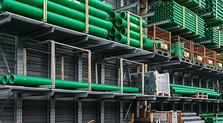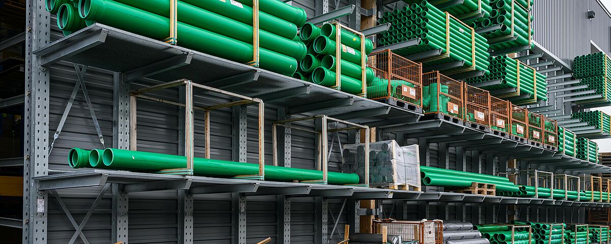 Aufgrund der unterschiedlichen Materialien rüstete OHRA die Lagerbereiche sowohl mit Kragarm- als auch mit Palettenregalen aus. Insgesamt 22 Regale, einfach- und doppeltief und mit einer Höhe von bis zu 7.500 Millimetern wurden installiert. Jedes Regal ist hinsichtlich Tragfähigkeit, Anzahl der Lagerebenen und Zubehör individuell für die verschiedenen Waren konfiguriert. Während die Regale für den Innenbereich in Wunschfarbe lackiert wurden, sind die Außenregale verzinkt und damit vor Witterungseinflüssen geschützt. Teilweise wurden die Regale mit Auflagerosten bzw. Gitterrosten ausgerüstet, um möglichst flexibel bei der Lagerung unterschiedlich dimensionierter Artikel zu sein. Eine Besonderheit ist zudem das Abschlussregal der Halle: Es wurde so ausgelegt, dass es eine Spundwand zwischen den Achsmaßen aufnehmen kann – es bildet somit die Rückwand des Gebäudes.