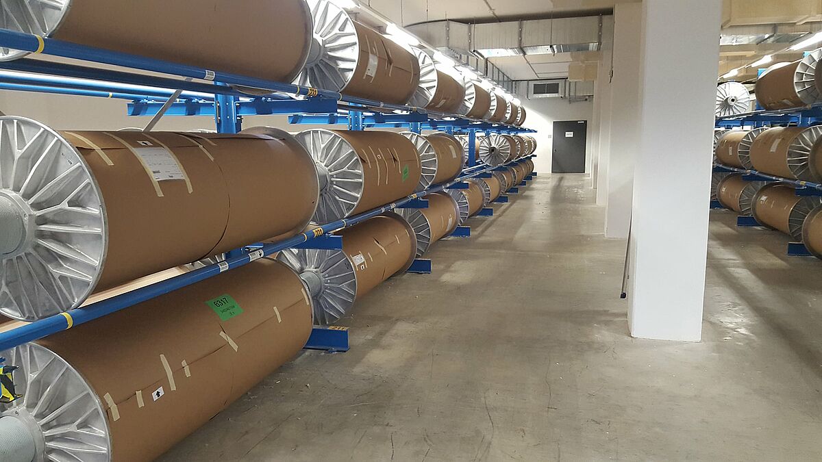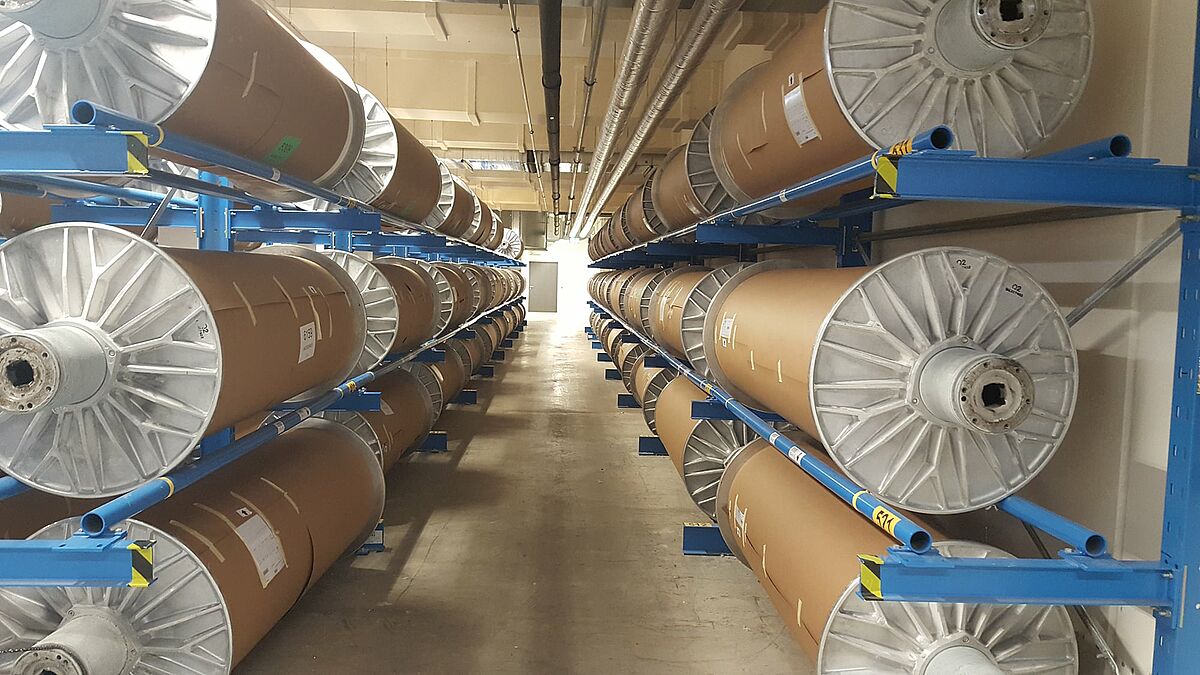 Insgesamt lieferte und montierte OHRA bisher drei Kragarmregale, auf denen die Kettbäume in drei Ebenen gelagert werden können. Die Regalständer – zwischen 2,3 und 2,9 Metern hoch – wurden an die Raumhöhe im Untergeschoss angepasst, so dass der Platz optimal ausgenutzt wird. Die Erweiterung des Lagers mit weiteren Kragarmregalen von OHRA ist bereits in Planung.