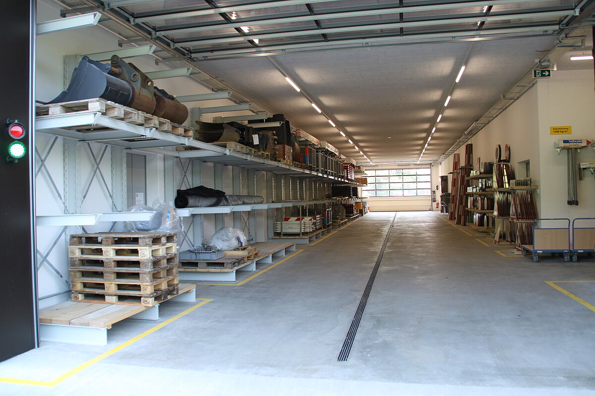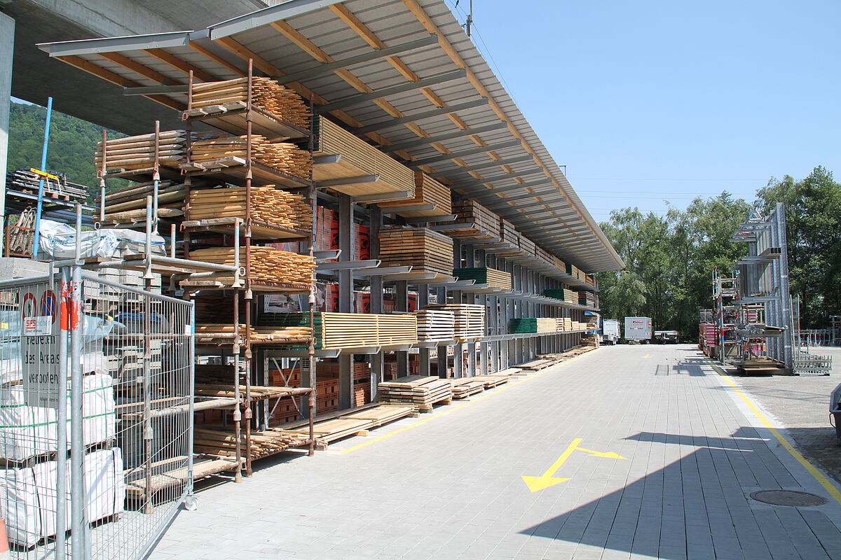 Der Werkhof von Gottlieb Müller in Rothrist dient seit Anfang 2018 als operative Plattform für Hoch- und Tiefbauprojekte des Unternehmens. Um die Vielfalt an Baustoffen und Inventar effizient lagern zu können, entschied sich die Firma Gottlieb Müller, zwei Regaltypen einzusetzen: Die Lagerhalle ist im Wesentlichen mit 16 3,5 Meter hohen und 8,45 Meter langen Palettenregalen ausgerüstet. Jedes Fach des Regals fasst drei bis zu je 1.000 Kilogramm schwere Europaletten bzw. Gitterboxen. Zusätzlichen Lagerplatz in der Halle bieten sieben 3,64 Meter hohe, einseitige Kragarmregale. Sie verfügen teilweise über Armbrücken und Fachböden, so dass neben Langgut wie Rohre oder Platten auch verschieden dimensionierte Ladehilfsmittel ohne störende Stützen gelagert werden können. Weitere Kragarmregale wurden im Außenbereich aufgestellt; sie schützt eine Feuerverzinkung vor Korrosion. Hier dominiert vor allem eine 43,5 Meter lange Regalzeile, deren oberste Kragarme als Dacharme ausgeführt sind: Sie tragen auf jeder Seite ein 2,7 Meter tiefes, leicht geneigtes Dach. Damit sind die eingelagerten Holz-Baustoffe vor dem direkten Einfluss vor Niederschlag geschützt. Die Kragarme aller Regale haben eine Tragfähigkeit von 1.200 Kilogramm pro Arm.