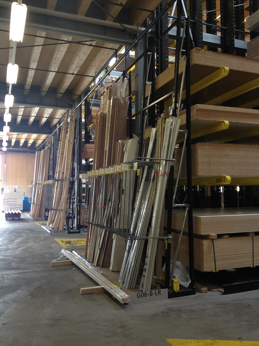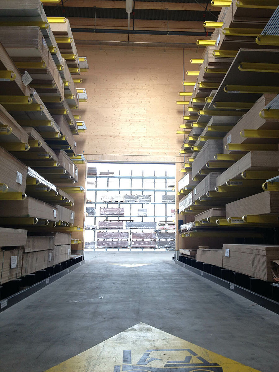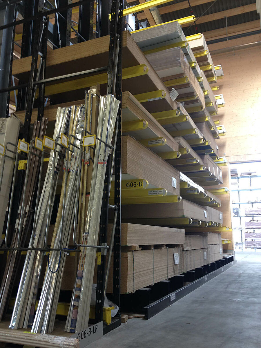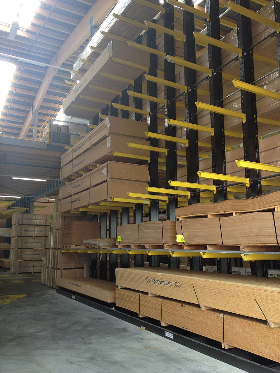 Das Lager in Biel ist in zwei Drive-through-Zonen auf rund 3000 Quadratmetern aufgeteilt. In der Halle montierte OHRA rund 600 laufende Meter Kragarmregale mit 9 Meter Höhe, sieben Lagerebenen und überwiegend 2,5 Meter tiefen Kragarmen, die von Vier-Wege-Staplern bedient werden. Vertikalregale am Ende der Regalzeilen ermöglichen zudem eine übersichtliche Lagerung von Leisten, Profilen und Rohren. Paletten- und Kragarmregale in feuerverzinkter Ausführung im Außenbereich bieten Platz für weitere 600 Paletten. Für die Lagerung von Dämm-Materialien ist eine 1000 Quadratmeter große Bühne in die Hallenkonstruktion integriert.