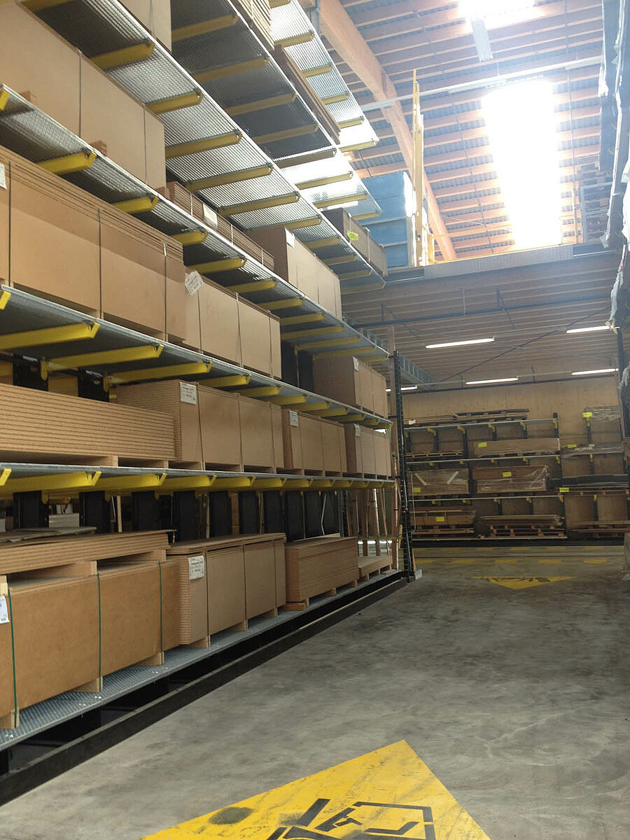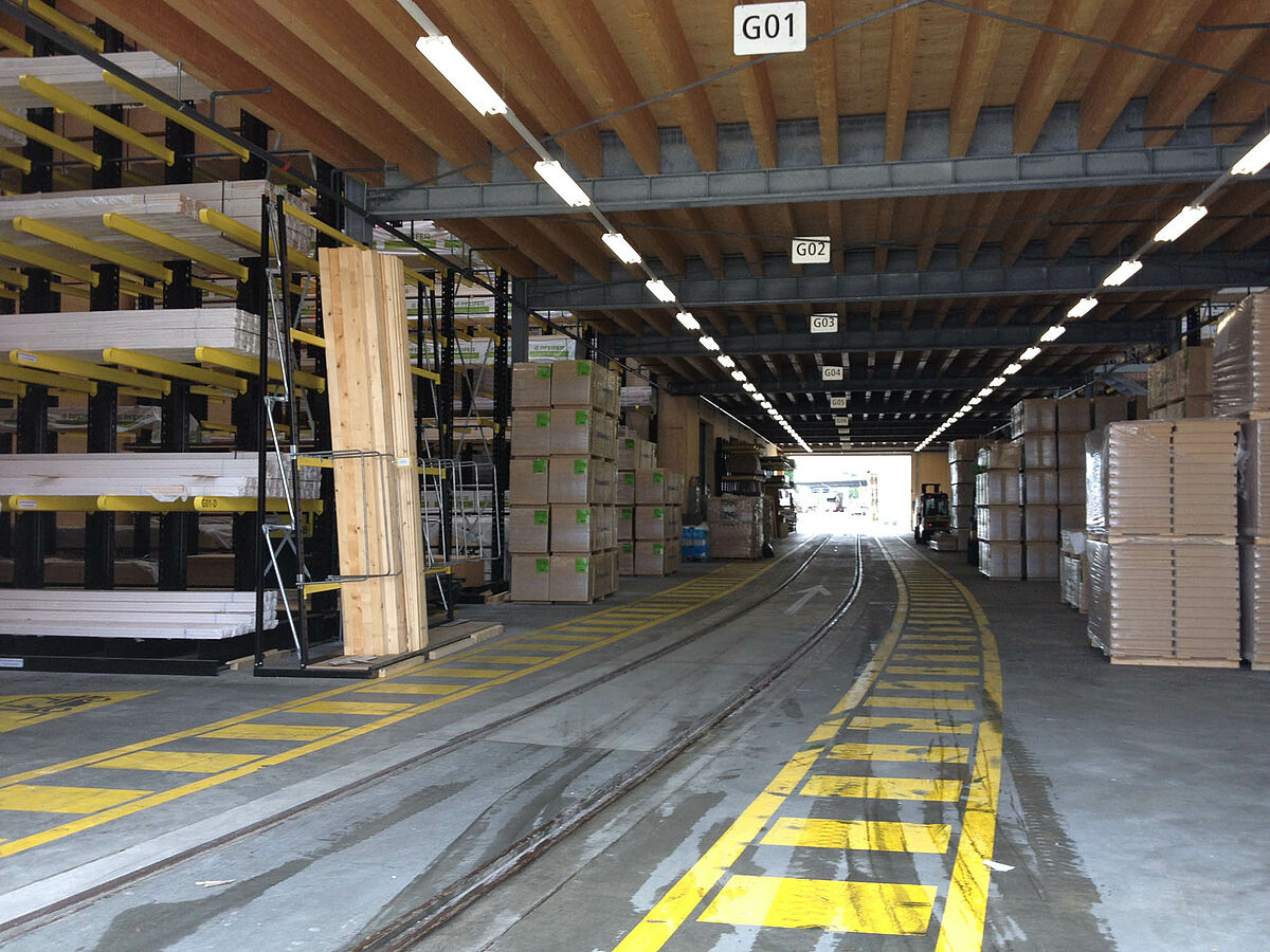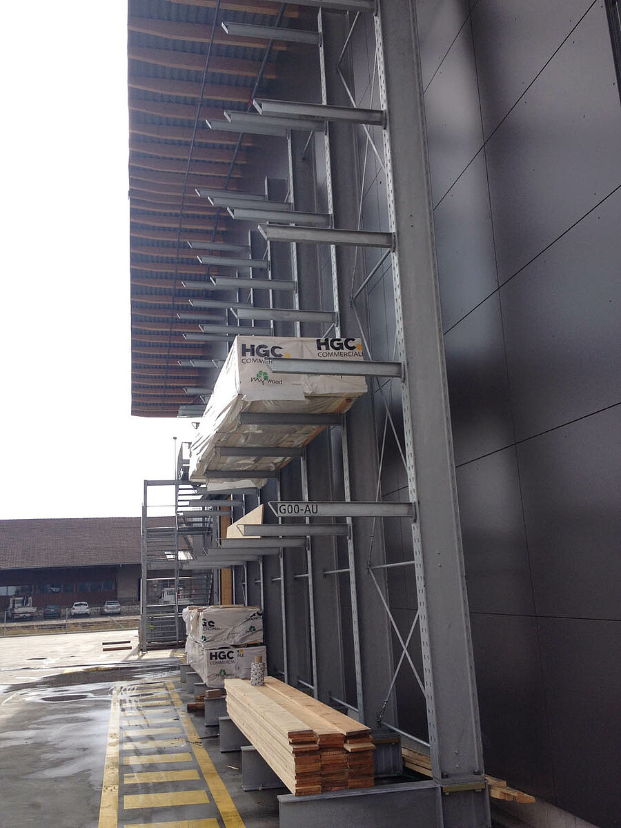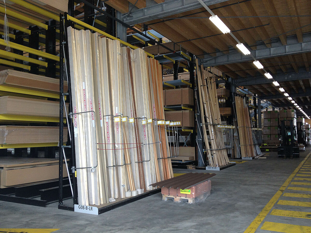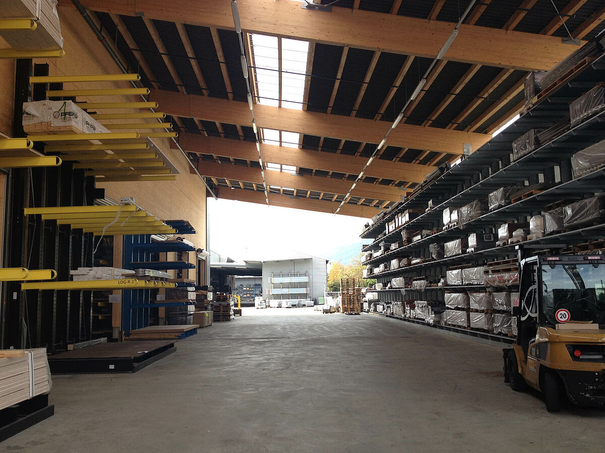 Das Lager in Biel ist in zwei Drive-through-Zonen auf rund 3000 Quadratmetern aufgeteilt. In der Halle montierte OHRA rund 600 laufende Meter Kragarmregale mit 9 Meter Höhe, sieben Lagerebenen und überwiegend 2,5 Meter tiefen Kragarmen, die von Vier-Wege-Staplern bedient werden. Vertikalregale am Ende der Regalzeilen ermöglichen zudem eine übersichtliche Lagerung von Leisten, Profilen und Rohren. Paletten- und Kragarmregale in feuerverzinkter Ausführung im Außenbereich bieten Platz für weitere 600 Paletten. Für die Lagerung von Dämm-Materialien ist eine 1000 Quadratmeter große Bühne in die Hallenkonstruktion integriert.