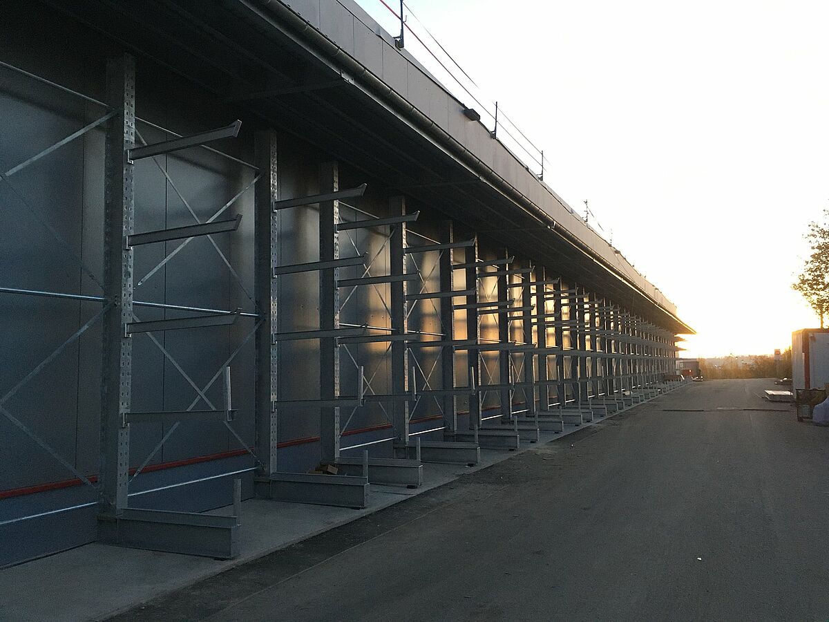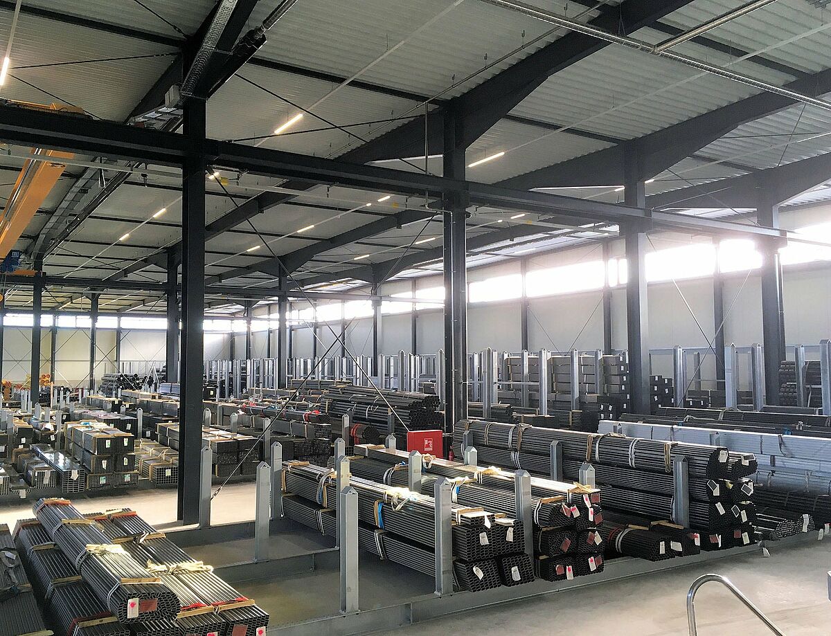 Während die schweren und langen Rohre bzw. Rohrbündel in den Rungenregalen Platz finden, werden leichte Rohre in OHRA-Kragarmregalen gelagert. Die rund 5 Meter hohen, verzinkten Regale wurden zum einen an den Innenwänden der Halle installiert, zum anderen umlaufend an den Außenwänden. Steckdorne und Hülsen an den Enden der 1,4 Meter langen und bis zu 640 Kilogramm tragenden Arme gewährleisten die sichere Lagerung der Rohre.