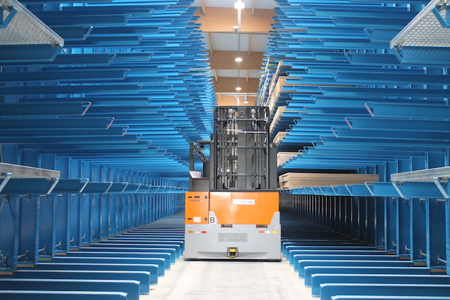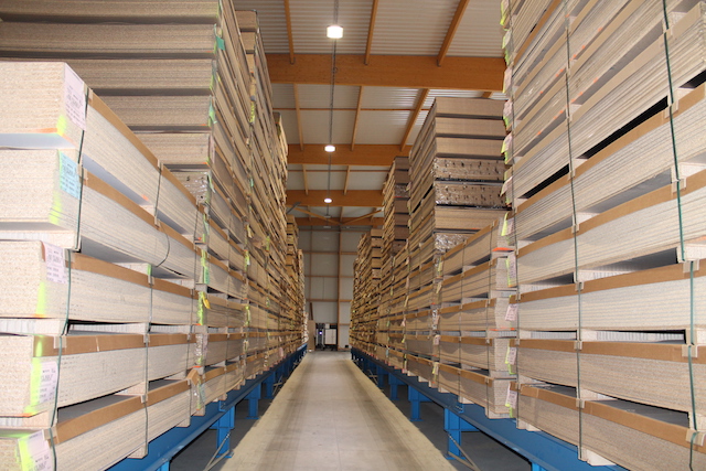 Hue-Socoda, einer der führenden Händler für Plattenwerkstoffe aus Holz in der Bretagne, hat das Lager an seinem neuen Standort in Langueux mit Regalsystemen von OHRA ausgestattet: Dank der stabilen Kragarmregale konnte die Regalanlage mit einer Höhe von neun Metern realisiert werden – und ist damit mehr als doppelt so hoch wie im alten Lager. Zusätzlich optimiert eine Lagerbühne die Flächenausnutzung im Lager: Mit ihr kann Kleinmaterial raumsparend auf zwei Etagen gelagert werden. 90 Zentimeter hohe Konsolen vereinfachen zudem im Wareneingang die Aufnahme der angelieferten Plattenpakete durch Stapler.