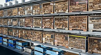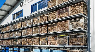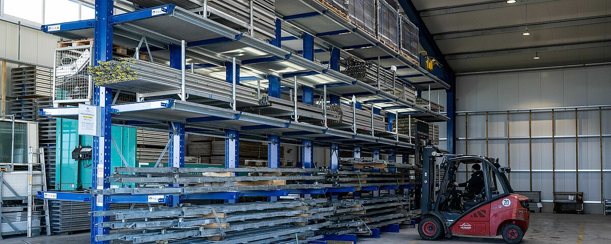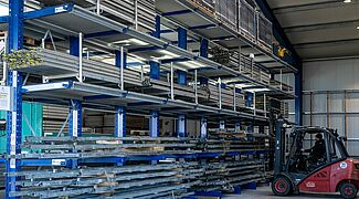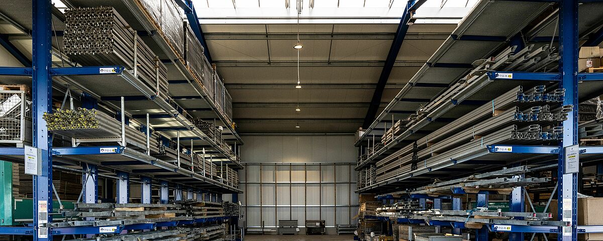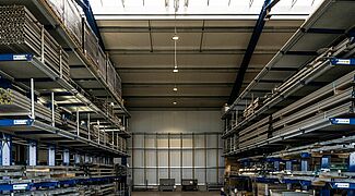 Eine Herausforderung stellte das inhomogene Lagergut dar: Artikel mit unterschiedlichen Gewichten, Längen und Höhen sowie in verschiedenen Lagerhilfsmitteln (Boxen, Paletten, Gestelle mit vier Eckfüßen) müssen in den neuen Regalen Platz finden. „Für uns war es in der Praxis wichtig, alle vorhandenen Lagergüter in nur ein einziges Lagersystem einzulagern“, so Fabian Bechtold, Geschäftsführer von LEUBE. Um das zu ermöglichen, wurden alle Lagerebenen der Kragarmregale mit Gitterböden ausgerüstet. Damit können die Artikel flexibel und nahtlos Stück an Stück eingelagert werden.