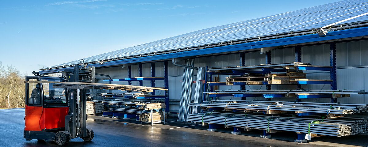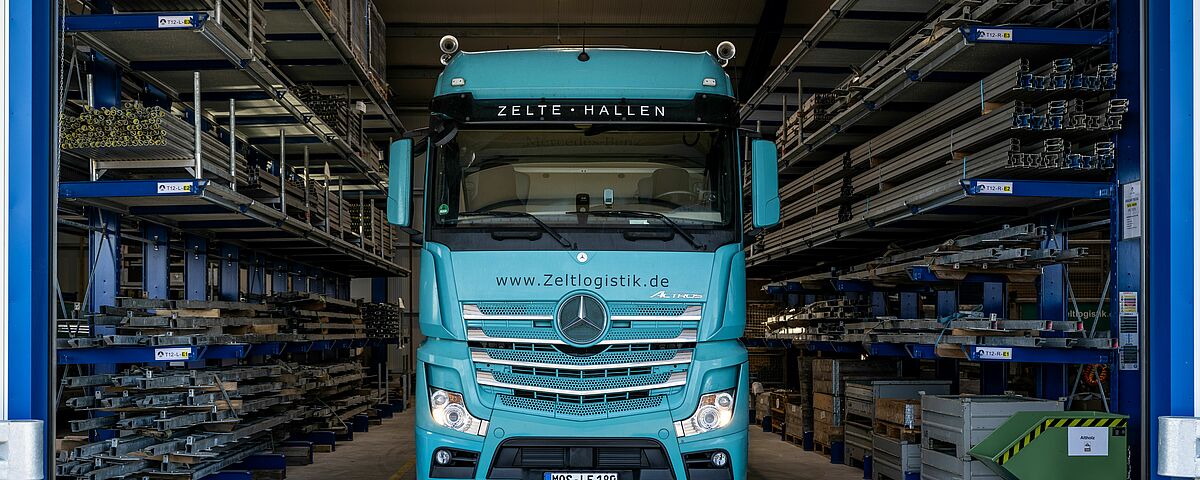 Ein zu großer Flächenbedarf und der daraus resultierende Platzmangel mit entsprechend ineffizientem Arbeiten führte zur Entscheidung, das bisherige Blocklager durch ein Regallager zu ersetzen. In der neu errichteten Halle stehen dazu drei doppelseitige Kragarmregale mit einer Länge von jeweils 16 Metern. Mit einer Ständerhöhe von 6,28 Metern bieten die Regale fünf Lagerebenen (inklusive Fuß) und damit ausreichend Platz, um das für die Zelte und Hallen benötigte Material auf fest zugeordneten Plätzen zu lagern. Zusätzlich installierte OHRA außen an den Seitenwänden der Halle jeweils ein 19,2 Meter langes einseitiges Kragarmregal, dort ist die Lagerware durch den Dachüberstand vor der Witterung geschützt. Die Tragkraft der Kragarme aller Regale beträgt 1.100 Kilogramm, die Länge 1.200 Millimeter.