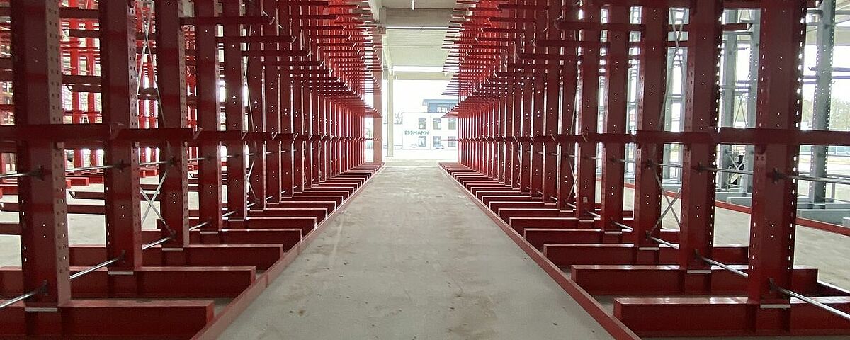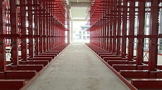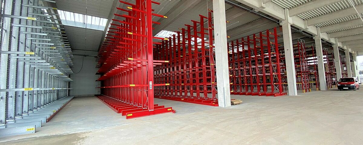 Höhere Lagerkapazitäten, schonendere Lagerung von Baustoffen und Holz, kürzere Transportwege - die Entscheidung des Baustoffhändlers Mayrose, am neuen Standort in Lingen nicht mehr im Blocklager, sondern in Regalen von OHRA zu lagern, führte zu einem klar strukturierten und deutlich effizienteren Lager. Rund 1.800 Lagerplätze in sechs Paletten- und drei Kragarmregalzeilen bietet die überdachte Anlage. Die für den Baustoffhandel eher ungewöhnliche maximale Lagerhöhe von 7,4 Metern ermöglicht eine hohe Ausnutzung der zur Verfügung stehenden Fläche.