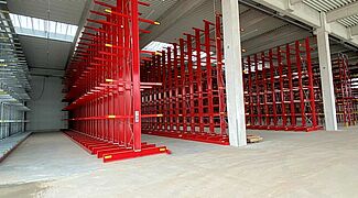 Am neuen, für die Privatkunden deutlich attraktiver gelegenen Standort werden die Waren nun in einer offenen Halle in über 30 Meter langen Kragarm- und Palettenregalen gelagert. Einige Fächer der Palettenregale sind mit Gitterrosten oder Spanplatten ausgestattet, sodass neben palettierter Ware auch Artikel in Kartons, Säcken oder anderen Gebinden untergebracht werden kann.