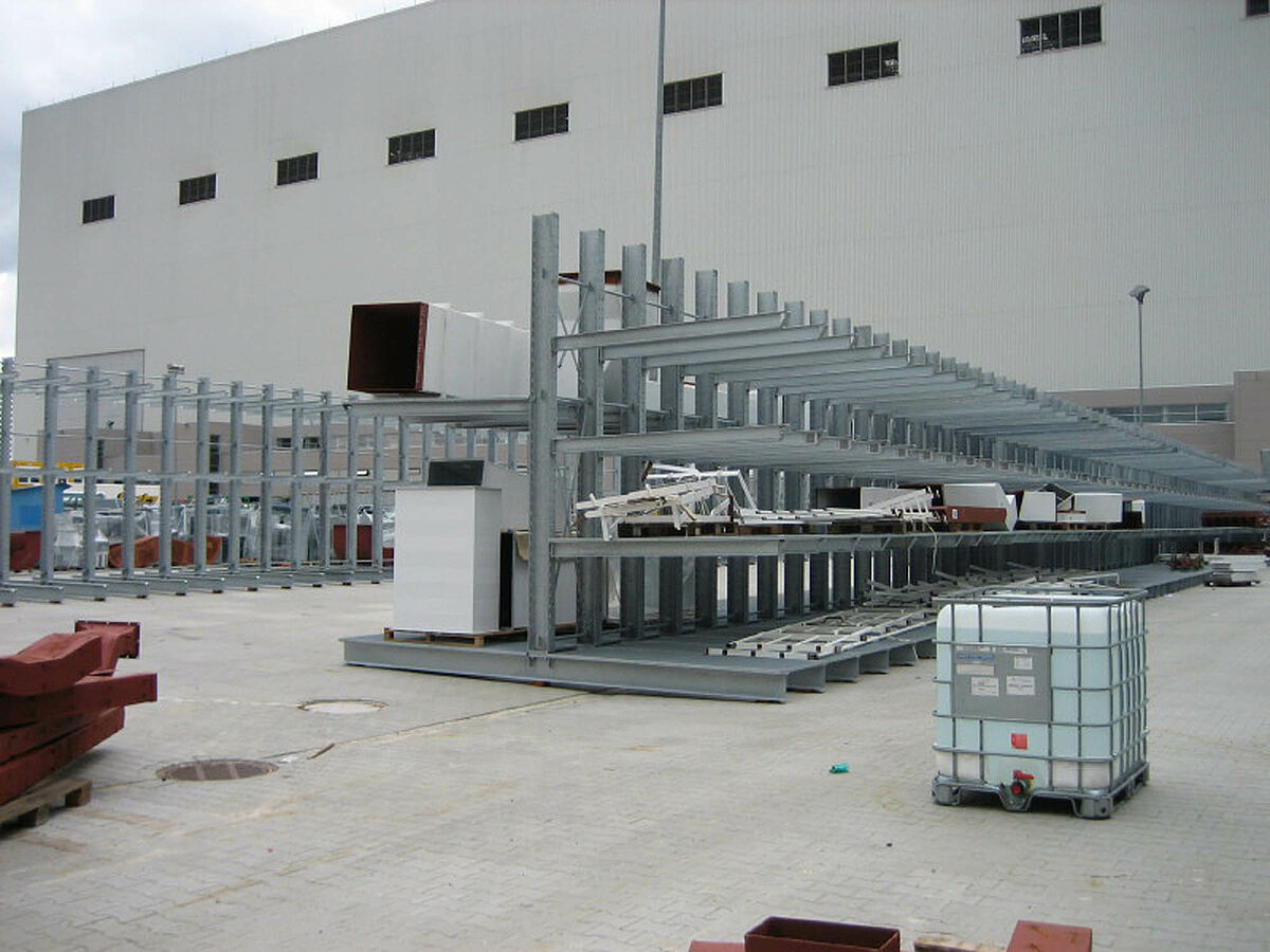 Aufgrund der hohen Gewichte und der schlechten Tragfähigkeit des Bodens wurde als Sonderlösung eine Regalunterbaukonstruktion entwickelt, welche die Punktlasten der einzelnen Regalständer optimal auf eine große Fläche ableitet. Für den Einsatz im Außenbereich wurde die Regalanlage in feuerverzinkter Qualität geliefert und durch erfahrene OHRA-Monteure kundengerecht montiert.