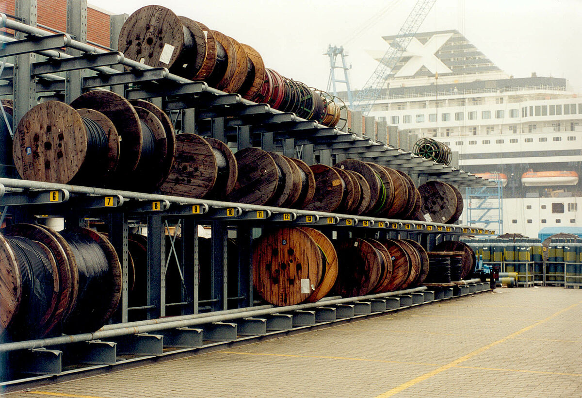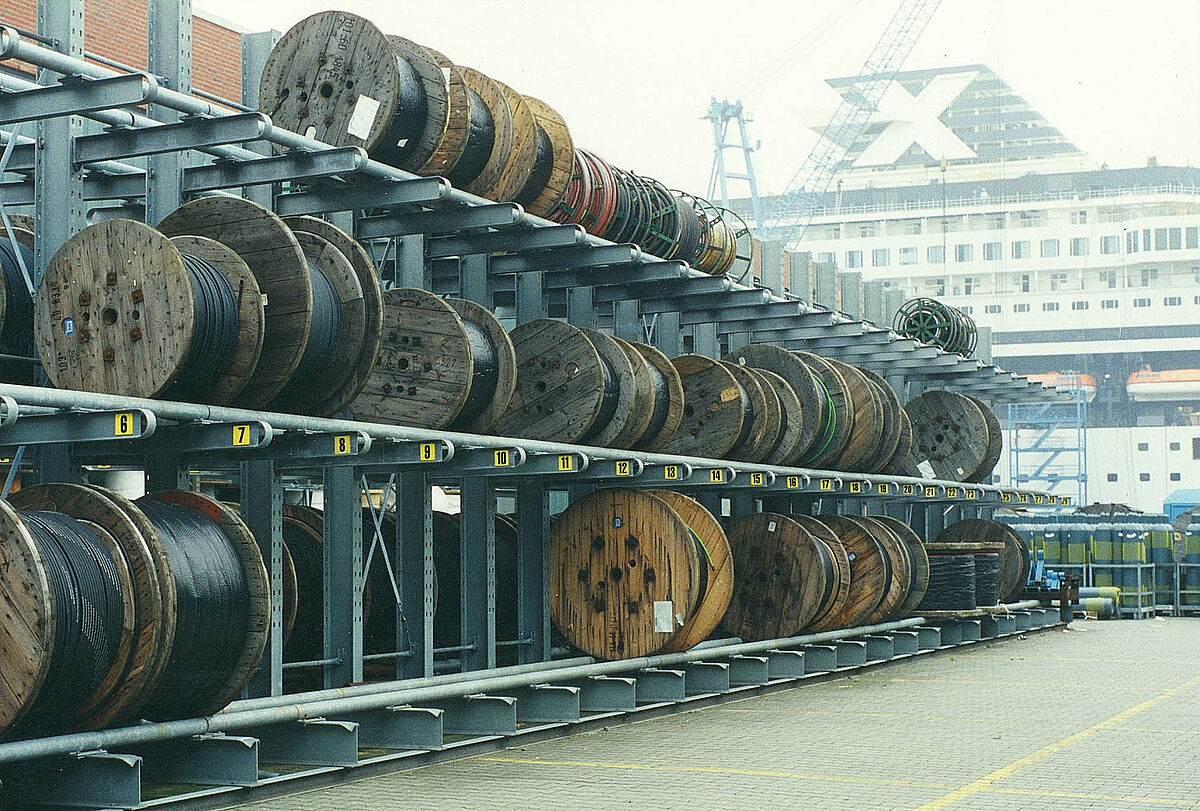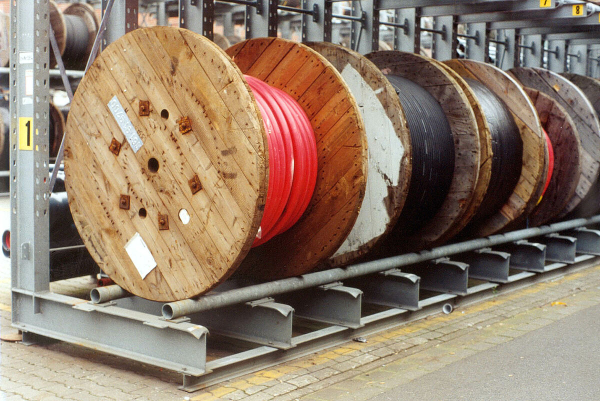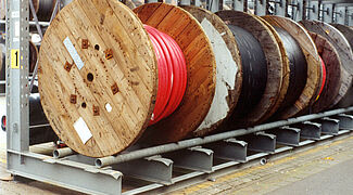 Schwere Kabeltrommeln mit unterschiedlichen Durchmessern und Gewichten lagern optimal und ohne Platzverlust in robusten OHRA-Kragarmregalen. Die Regale sind 4.500 mm hoch und haben eine Nutztiefe von 1.400 mm und 1.200 mm, je nach Durchmesser der Trommeln.
