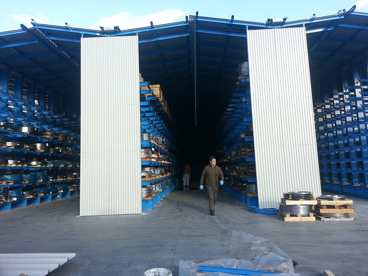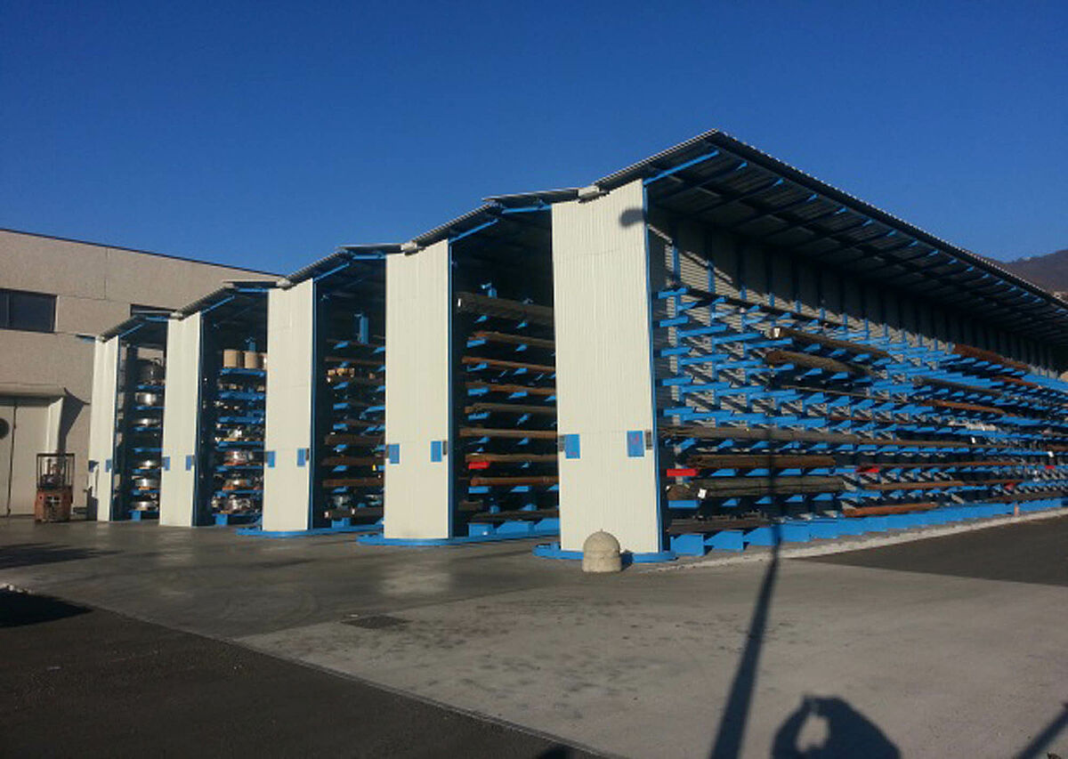 Rosa Catene produziert am Standort Caloziocorte Ketten für Anwendungen in der Landwirtschaft, in Industrie und im Gewerbe. Das kontinuierliche Wachstum des Unternehmens erforderte den Bau eines neuen Rohmateriallagers für palettierte Blechbänder und gebündelte Stahlstäbe. Den Auftrag zum Bau des Lagers bekam OHRA: Der in Kerpen, Deutschland, ansässige Spezialist für Kragarmregalsysteme überzeugte Rosa Catene mit einem Konzept, bei dem die Ständer der Kragarm-Regale gleichzeitig als tragende Konstruktion für die Halle dienen. Bei dem vorgeschlagenen Konzept überlappen sich die Dachelemente der sechs Regalzeilen gegenseitig. So entsteht ein vollständig überdachtes, modulares Lager, das zukünftig problemlos erweitert werden kann. Zudem bietet diese Konstruktion deutliche Kostenvorteile und ist schneller errichtet als eine herkömmliche Halle.