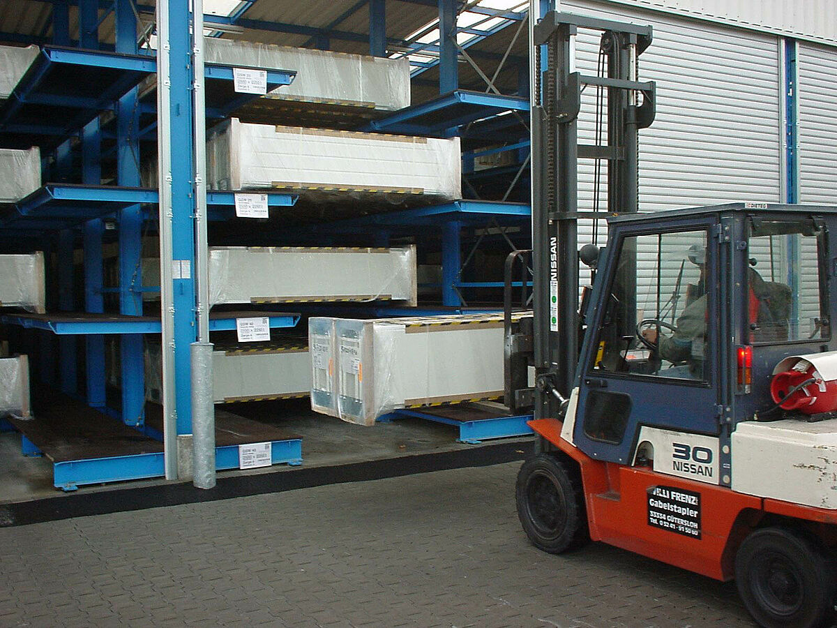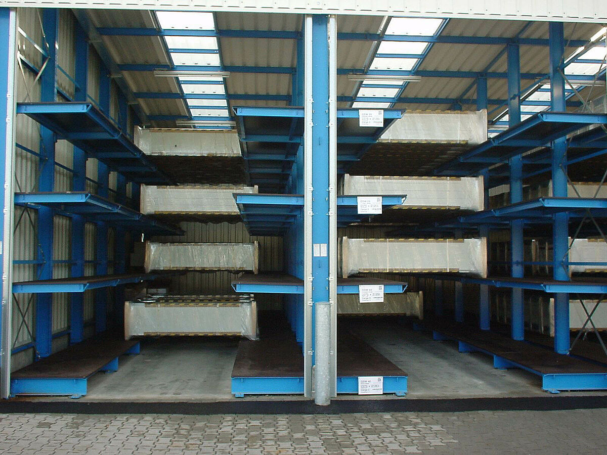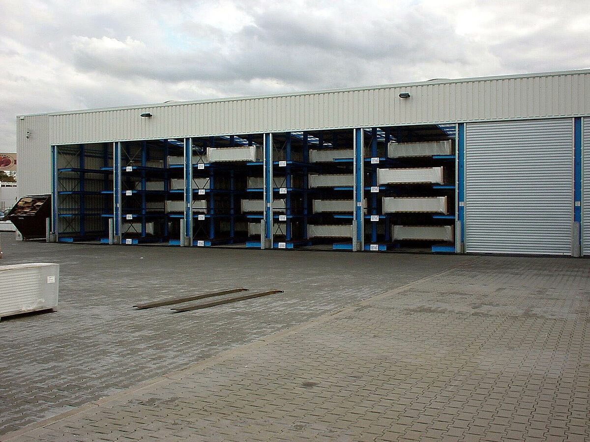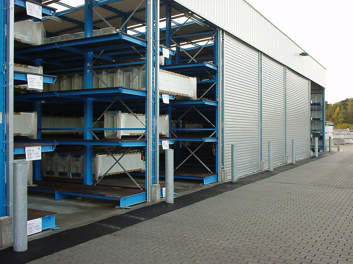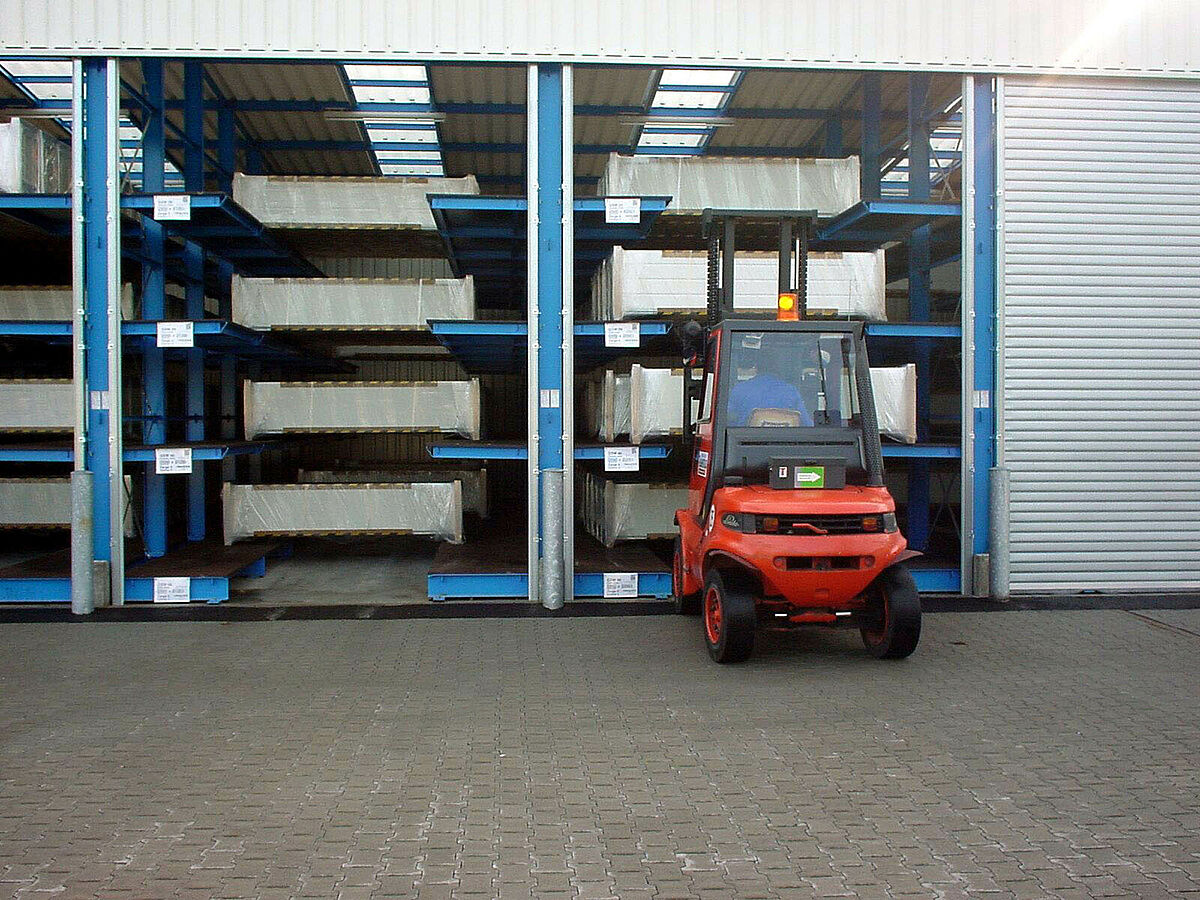 Dabei dienen die Kragarmregalebenen in der Tiefe als Auflageflächen. Die Tore können sortenrein in die jeweiligen Fächer eingebracht werden und sind somit unter optimaler Raumausnutzung gelagert. Mit nur wenigen Staplerhüben kann ein ganzer Schacht entleert und auf den Lkw entladen werden.