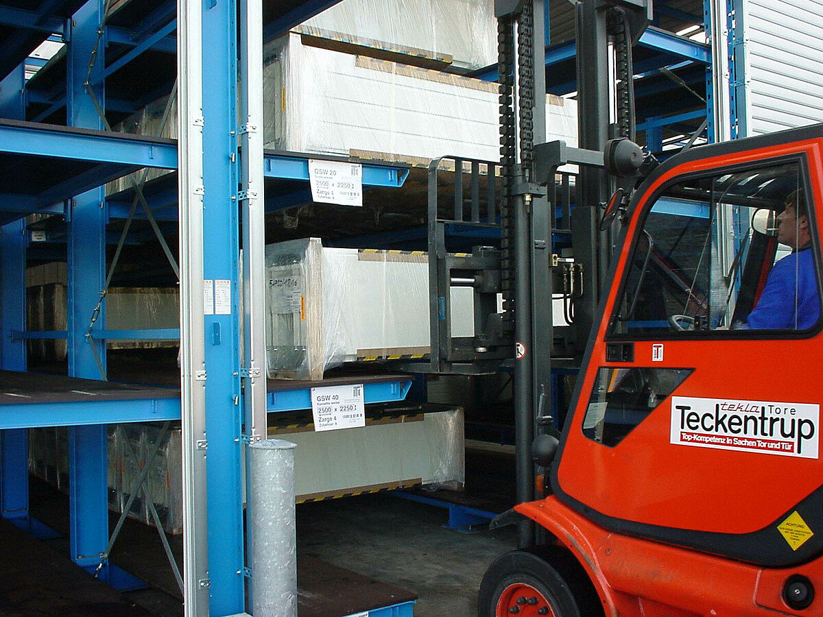 Die Fa. Tekla fertigt die Tore zumeist in auftragsbezogener Einzelanfertigung oder kleineren Losgrößen an verschiedenen Standorten in Deutschland. In Verl verlassen die Sektional- und Rolltore die hochmoderne Fertigung und werden in OHRA-Regalen für den Versand kommissioniert und bereit gehalten.