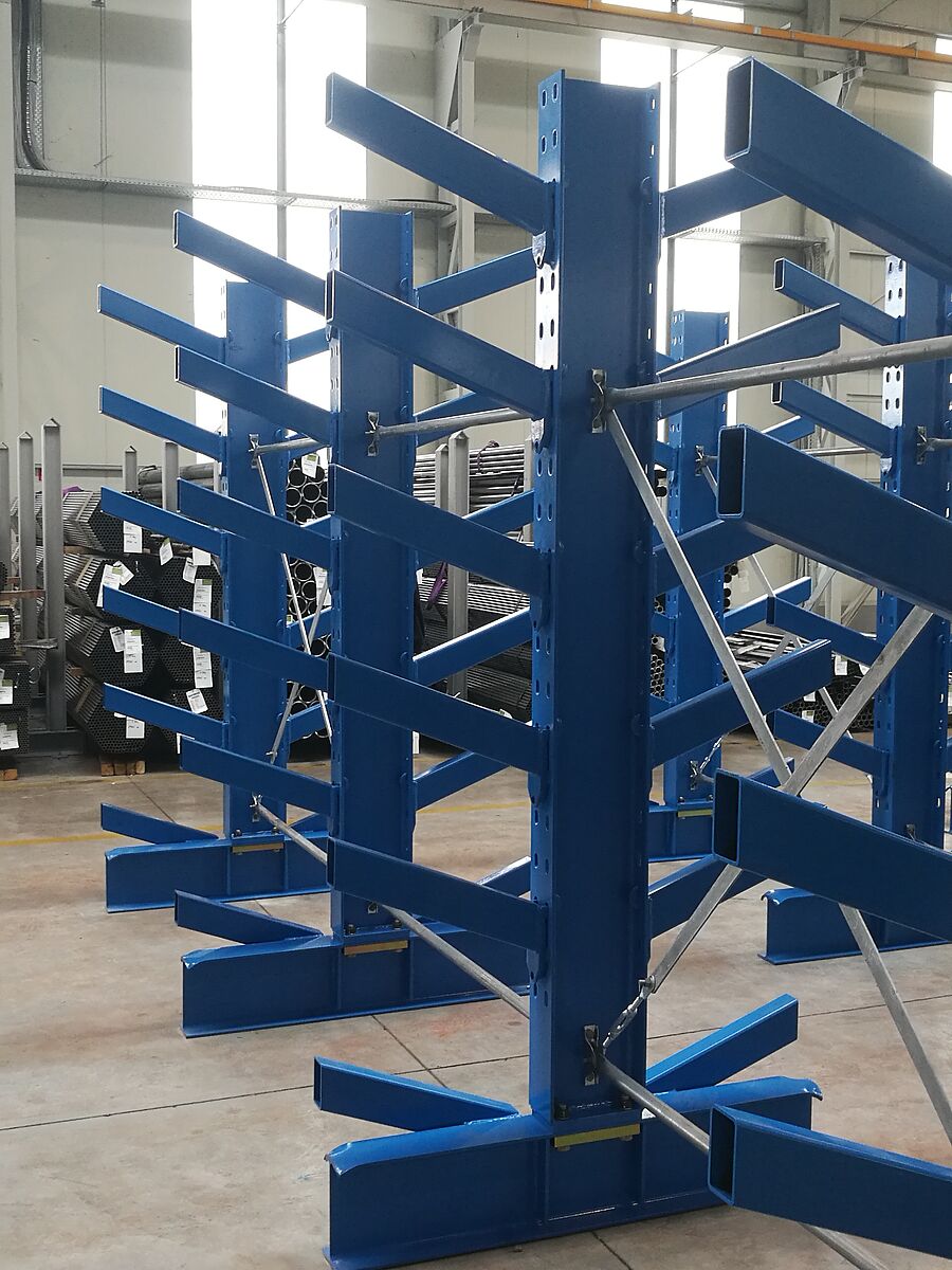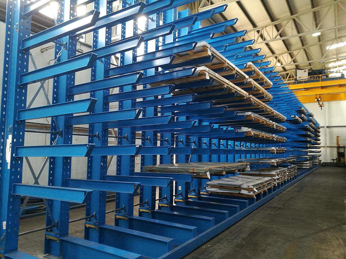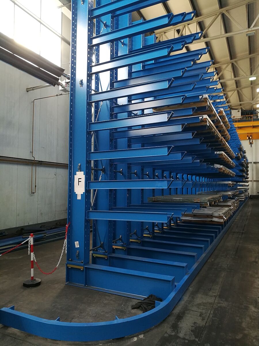 In einem zweiten Lagerbereich installierte OHRA zudem sieben Zeilen seiner Schrägarmregale. Hier werden Rohre, Profile und Stäbe mittels Kran eingelagert. Bei diesem Regaltyp sind die Kragarme mit einer 20° Steigung gefertigt. Das Langgutpaket rutscht so in das vorgesehene Fach, die Einlagerung mit dem Kran wird erheblich vereinfacht. Auch beim Schrägarmregal sind die Arme eingehängt. Die montierten Regale sind 2,5 Meter hoch und bieten auf sieben Ebenen Platz für bis zu 6.000 Millimeter lange Waren. Die Belastbarkeit der 500 Millimeter langen Arme beträgt 800 Kilogramm.