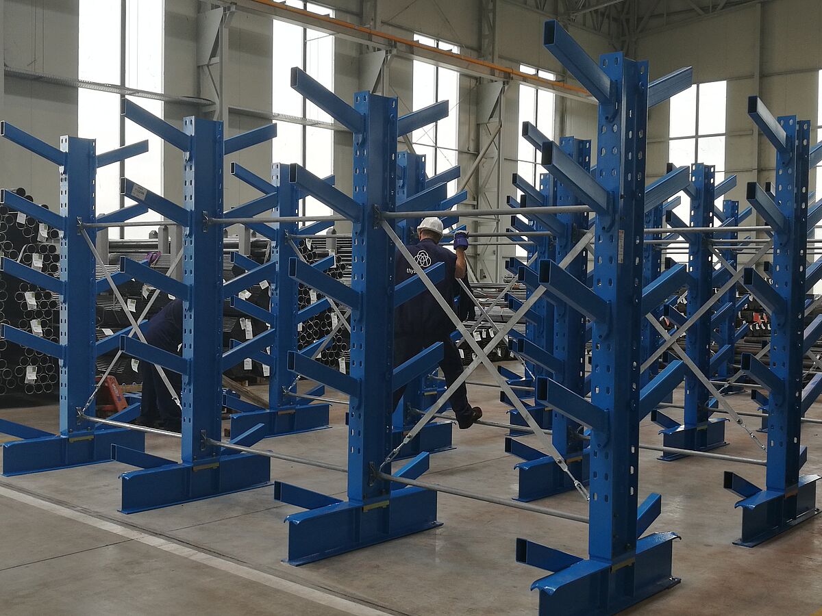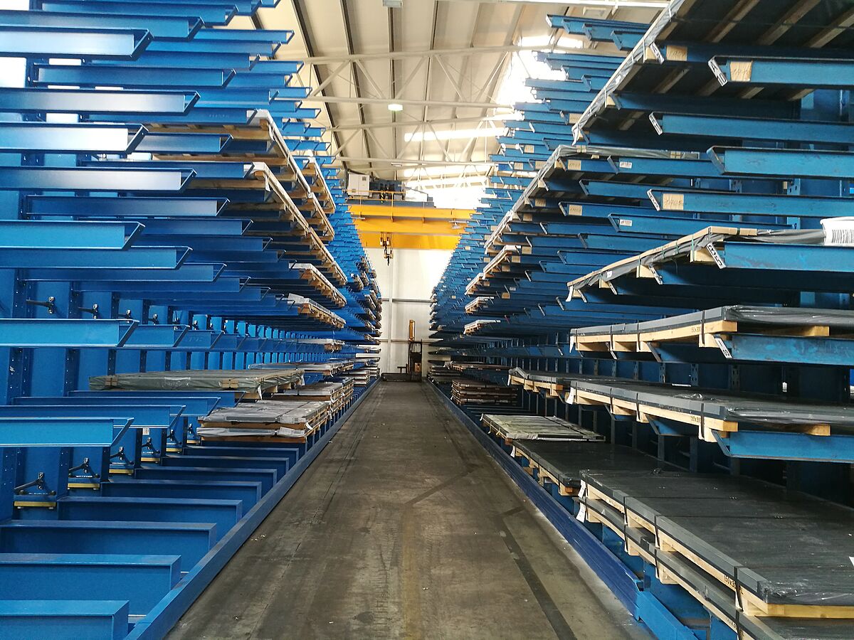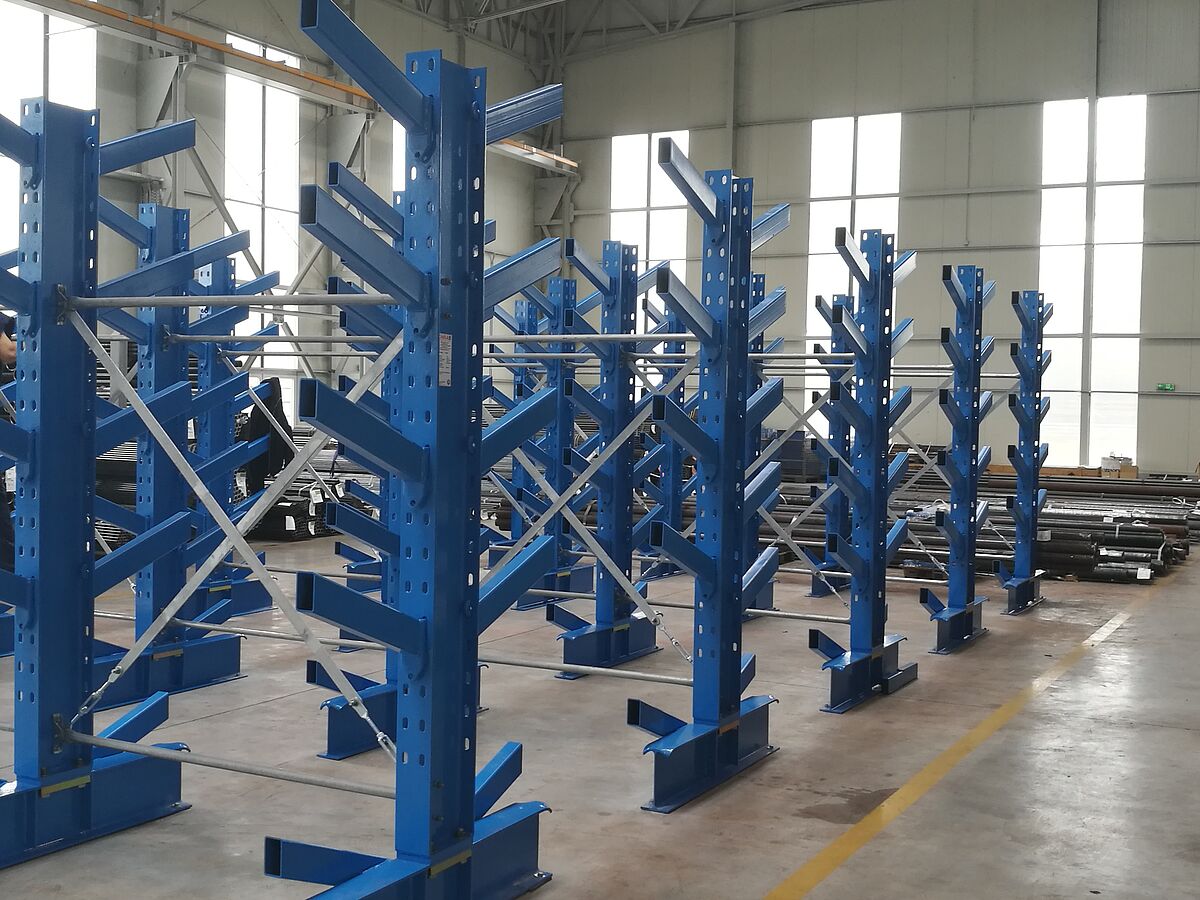 In einem zweiten Lagerbereich installierte OHRA zudem sieben Zeilen seiner Schrägarmregale. Hier werden Rohre, Profile und Stäbe mittels Kran eingelagert. Bei diesem Regaltyp sind die Kragarme mit einer 20° Steigung gefertigt. Das Langgutpaket rutscht so in das vorgesehene Fach, die Einlagerung mit dem Kran wird erheblich vereinfacht. Auch beim Schrägarmregal sind die Arme eingehängt. Die montierten Regale sind 2,5 Meter hoch und bieten auf sieben Ebenen Platz für bis zu 6.000 Millimeter lange Waren. Die Belastbarkeit der 500 Millimeter langen Arme beträgt 800 Kilogramm.