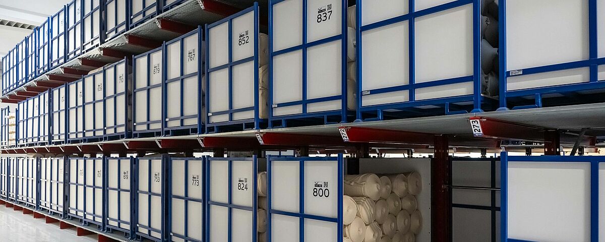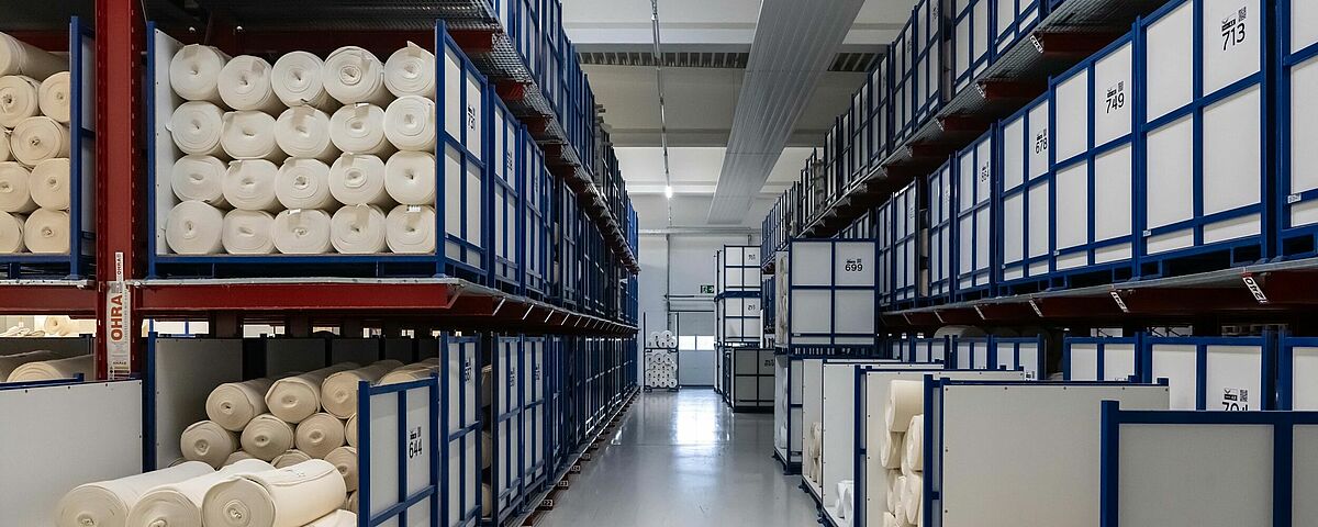 Kern der Umgestaltung war die Umstellung von Boden- auf Regallagerung. Da Lagerplätze für verschiedene Stoffqualitäten in unterschiedlichen Zuständen benötigt wurden, entschied sich TRIGEMA, das Lager sowohl mit Palettenregalen als auch mit Kragarmregalen von OHRA auszustatten. Um die Produktion nicht zu behindern, montierte OHRA die Regale innerhalb eines Wochenendes. Die Palettenregale wurden teils mit Spanplattenböden und Gitterrosten ausgestattet, auch die Kragarmregale erhielten Gitterrostböden – so entstand eine durchgängige Lagerebene, auf der die unterschiedlichsten Lagerhilfsmittel (verschiedene Palettenformate, Kartons oder Stoffe ohne Lagerhilfsmittel) Platz finden.