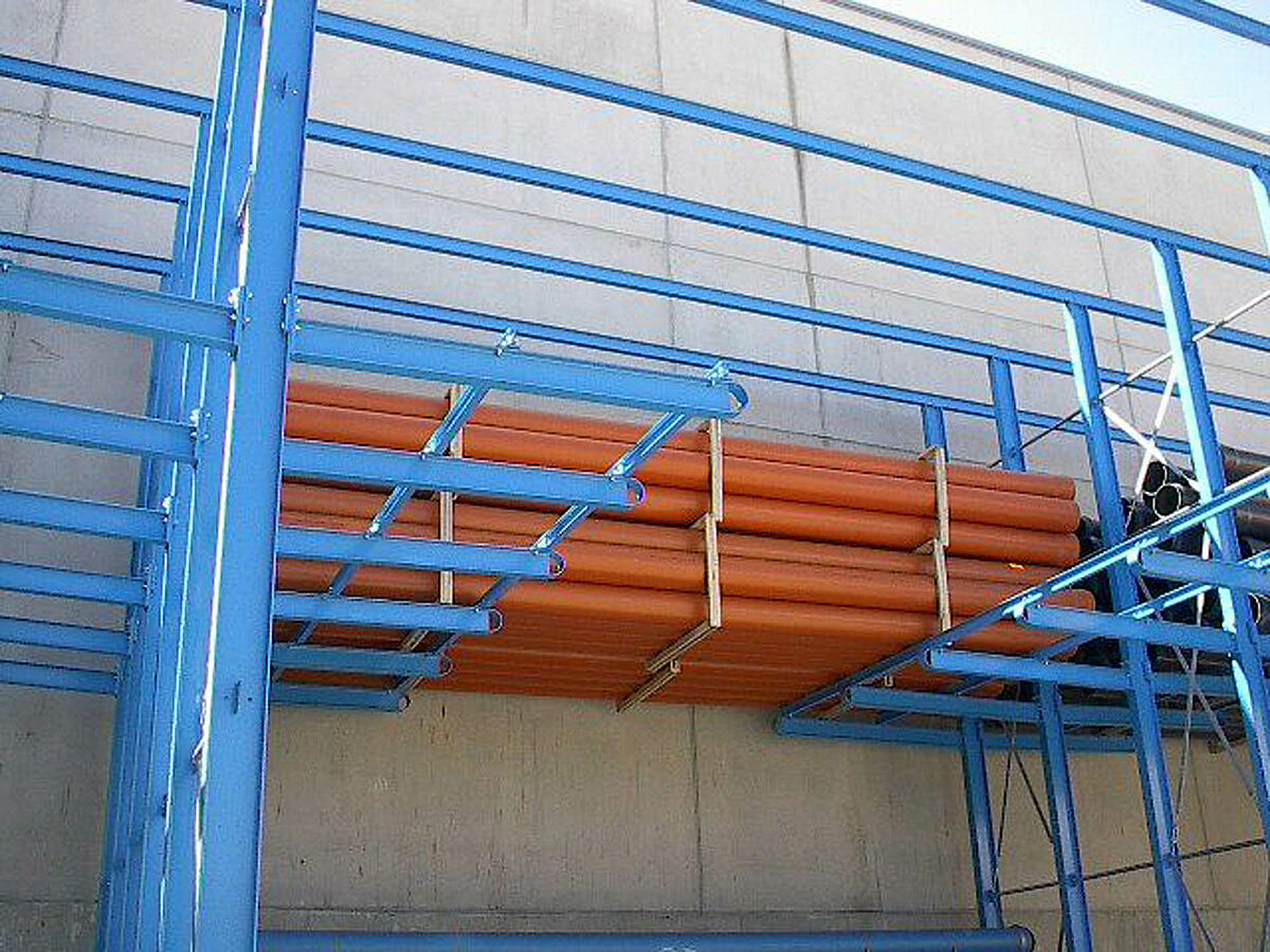 Als Ergänzung zum Einfahrregal lieferte und montierte OHRA zusätzlich robuste Kragarmregale. Hier werden die Sorten gelagert, die nicht so häufig benötigt werden. Die Rohrbündel lagern hier in mehreren Ebenen übereinander. Dank der Kragarmlängen von bis zu 2.500 mm kann der Kunde hier auch 2 Rohrpakete hintereinander auf einer Ebene lagern.