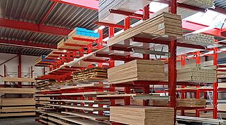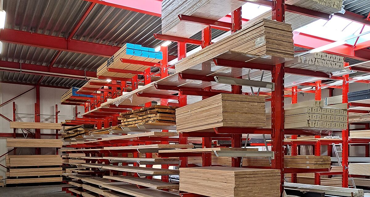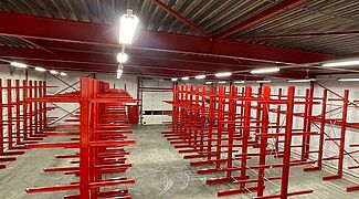Aufgrund der guten Erfahrungen, die van Deuveren bereits mit Regalen von OHRA gemacht hatte, wurde auch der neue Firmensitz mit Regalsystemen des europäischen Marktführers für Kragarmregale ausgerüstet. OHRA fertigt die Regalständer und Kragarme aus vollwandigen, warmgewalzten IPE-Stahlprofilen, das heißt, die Kragarmregale bleiben auch bei voller Auslastung dauerhaft stabil und sorgen für ein hohes Maß an Sicherheit für Personal und Kunden. Die Regale werden von OHRA grundsätzlich individuell nach dem jeweiligen Bedarf des Auftraggebers hergestellt – bei van Deuveren galt das nicht nur in Bezug auf Dimensionierung und Traglasten, sondern auch auf die Farbe.